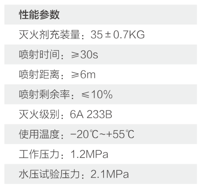 - 性能參數:滅火劑充裝量: 35±0.7KG